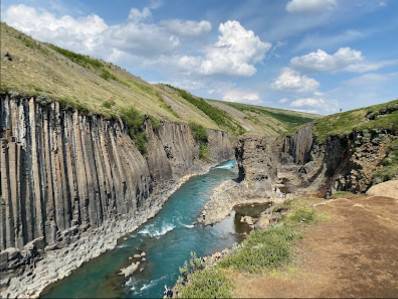 Une petite randonnée pédestre facile (environ 5 km aller-retour) sur un sentier empierré qui nous amène sur le magnifique canyon de Studlagil. Nous avons eu la chance de faire cette balade avec le soleil et la couleur de l'eau était magique. Les colonnes de basalte magnifient le spectacle. Possibilité de descendre dans le canton au bord de l'eau et de faire de très belles photos !